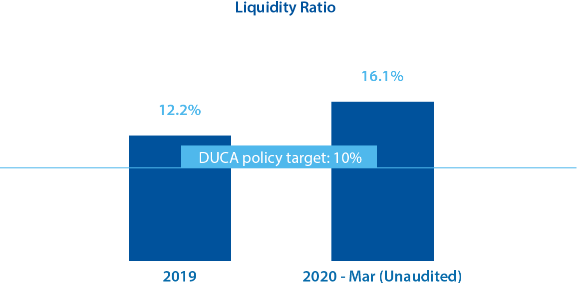 Liquidity: we monitor and manage our cash and cash-equivalent assets (liquidity) very closely at DUCA. Your Credit Union has established liquidity targets and tolerances that ensure strength and stability in funding our operations in normal circumstances and in more challenging times. As we monitored the progression of the COVID-19 pandemic we began to increase our levels of liquidity steadily and have built and maintain a substantial liquidity cushion